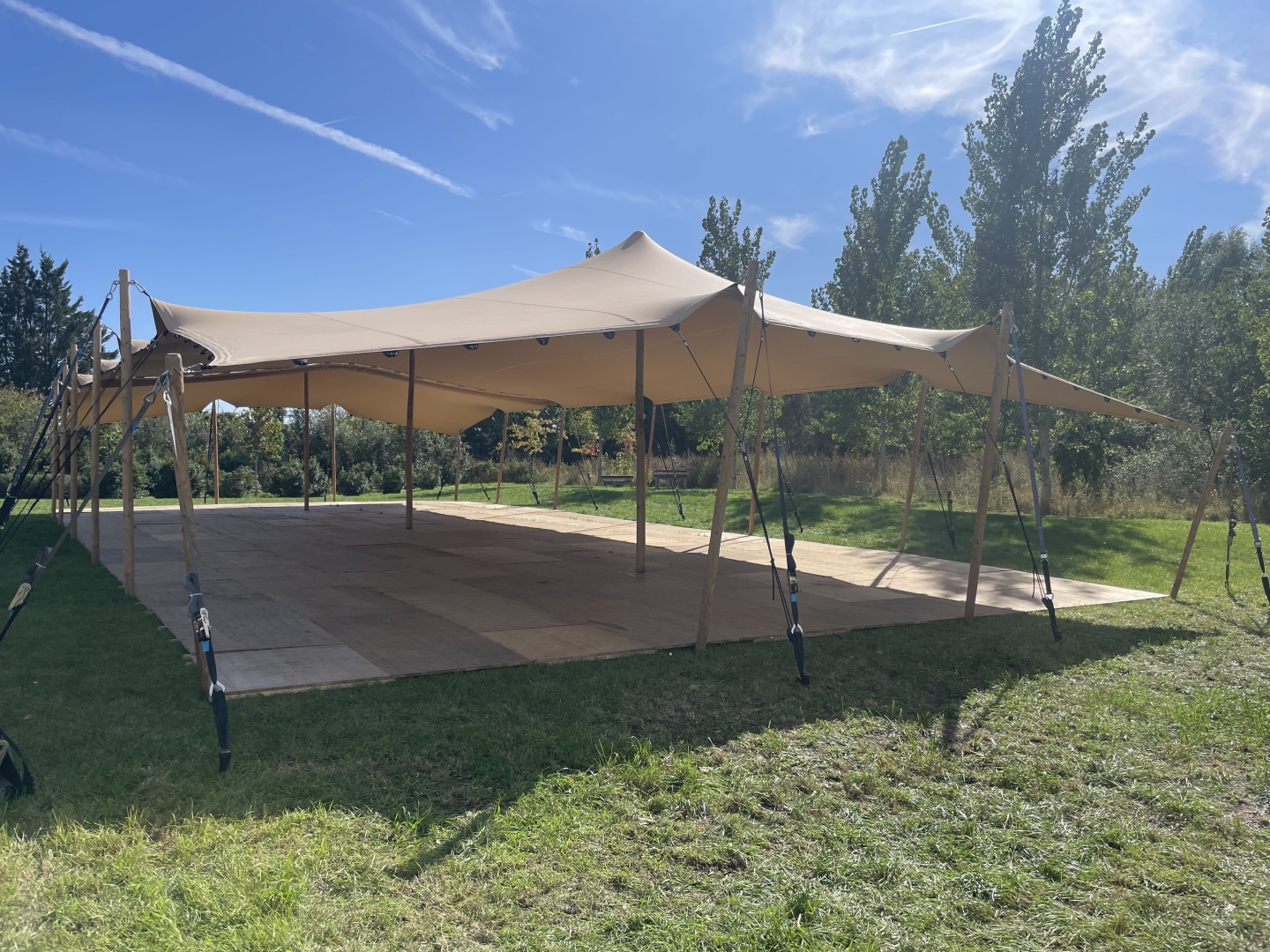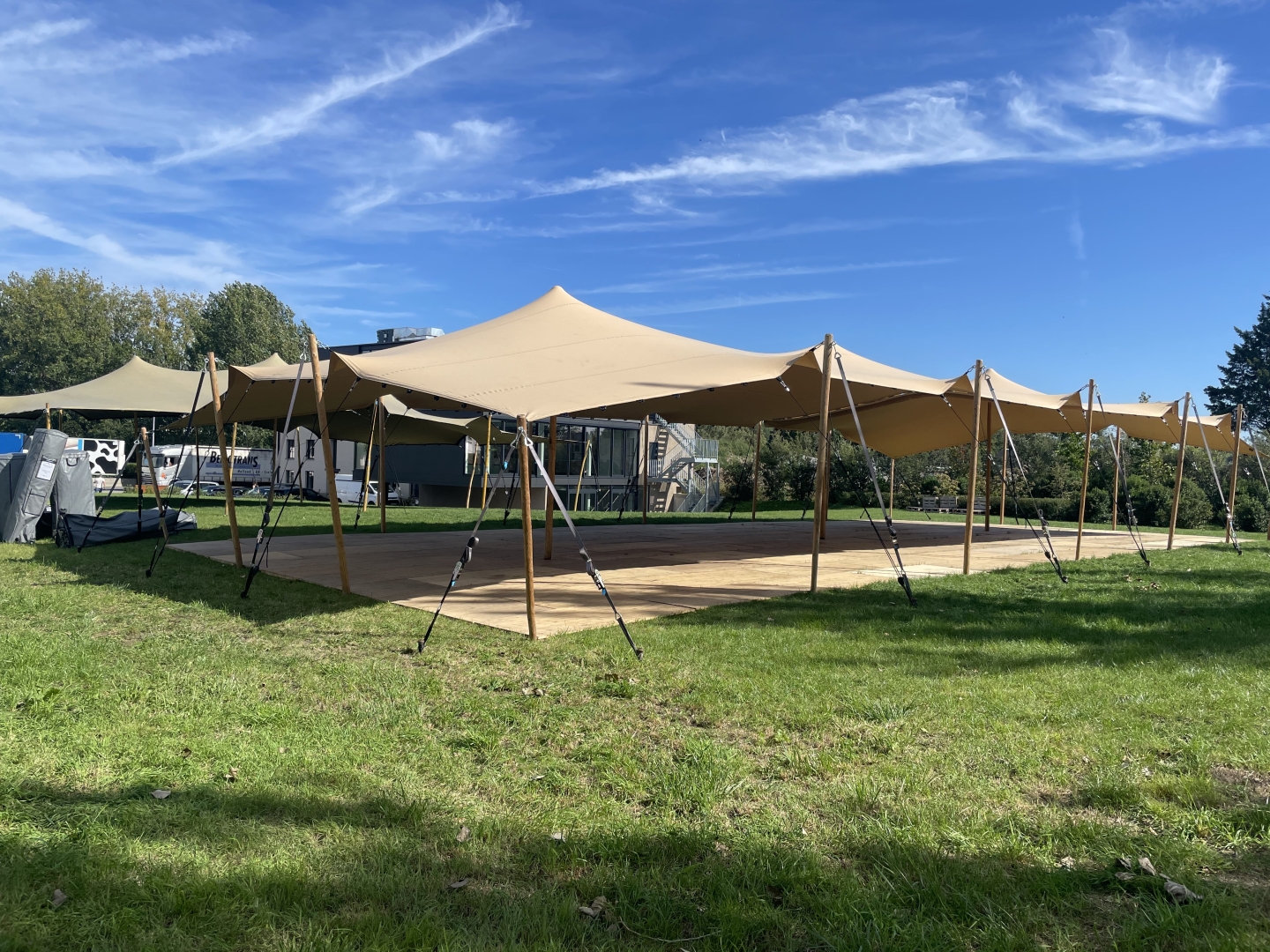 Een stretchtent kan enkel opgebouwd worden op open locaties én wanneer de ondergrond gras, grond of zand is! Een stretchtent kan niet op een verharde ondergrond opgebouwd worden.